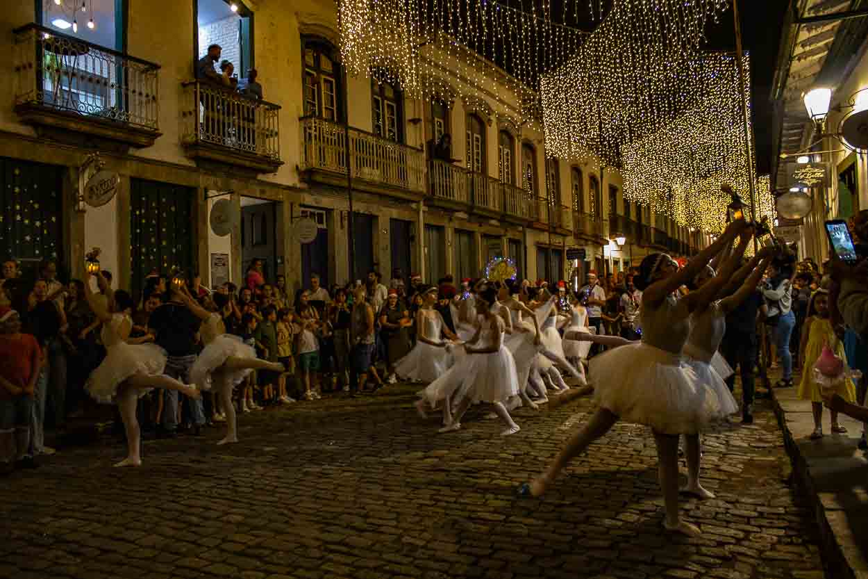 E quem acha que o cortejo acabou por aí está muito enganado! A banda seguiu agitando o clima com trompetes e batuques, bem acompanhados por uma turma animada com balões coloridos com led. O Circo Volante distribuiu risadas e surpresas, com muita pirofagia e malabarismos, acompanhando-os muitas bailarinas quase etéreas vestidas de branco.