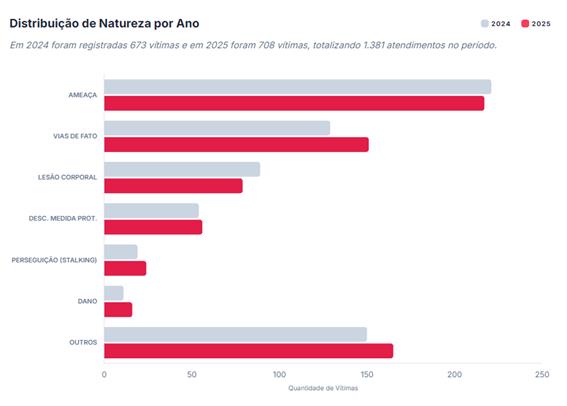 Em comparação com os dados da pesquisa do Armazém SIDS/REDS de 2024 para 2025, houve um aumento de 5,2% nos registros de violência doméstica contra a mulher. Esse dado pode significar tanto um aumento da violência no município quanto uma maior confiança das mulheres em denunciar seus agressores.