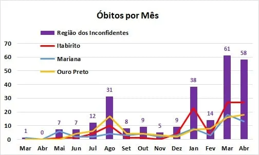 Em Mariana, em abril, são novos 749 casos confirmados e 13 óbitos. Esse número de mortes é inferior a março, em que foram perdidas 18 vidas, revelando que o município vem conseguindo reduzir o número de mortes por Covid.