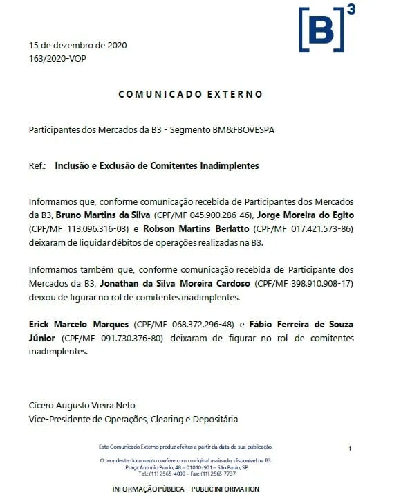 Essa confiança, segundo o ex-prefeito, só teria sido quebrada quando foi descoberto que, desde dezembro do ano passado, Jorge Egito estava impedido de operar como investidor. “Ele só me pagou porque acreditou que eu fosse dar um valor 10x, 20x que eu já tinha investido trazendo mais pessoas pra aplicar com ele. Até dezembro ele conseguia aplicar mesmo, mas em dezembro a B3 bloqueou ele por algum investimento errado, ele não investia mais, mas continuou recebendo o dinheiro das pessoas”.