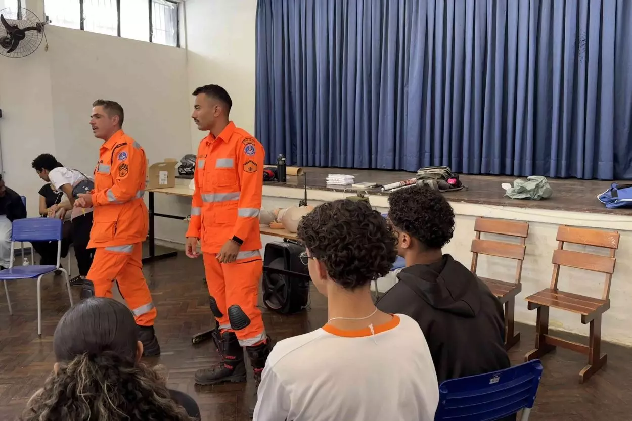 A dinâmica foi proposta a partir do entendimento de que o luto fragiliza a saúde mental, nuance cuja compreensão veio a partir de um questionário aplicado nas escolas antes do início das ações. Durante o momento com os bombeiros, os alunos foram divididos em duas estações de aprendizado, uma interna e outra externa, nas quais aprenderam técnicas de desengasgo e de como apagar fogo de botijão de gás.