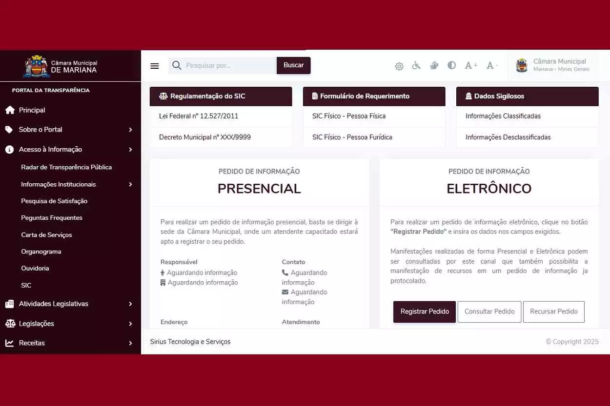 O site da câmara Municipal de Mariana, reformulado este ano pela empresa Sirius Tecnologia e Serviços, contem uma página referente ao Serviço de Informação ao Cidadão (SIC), na área de Acesso à Informação do Portal da transparência.