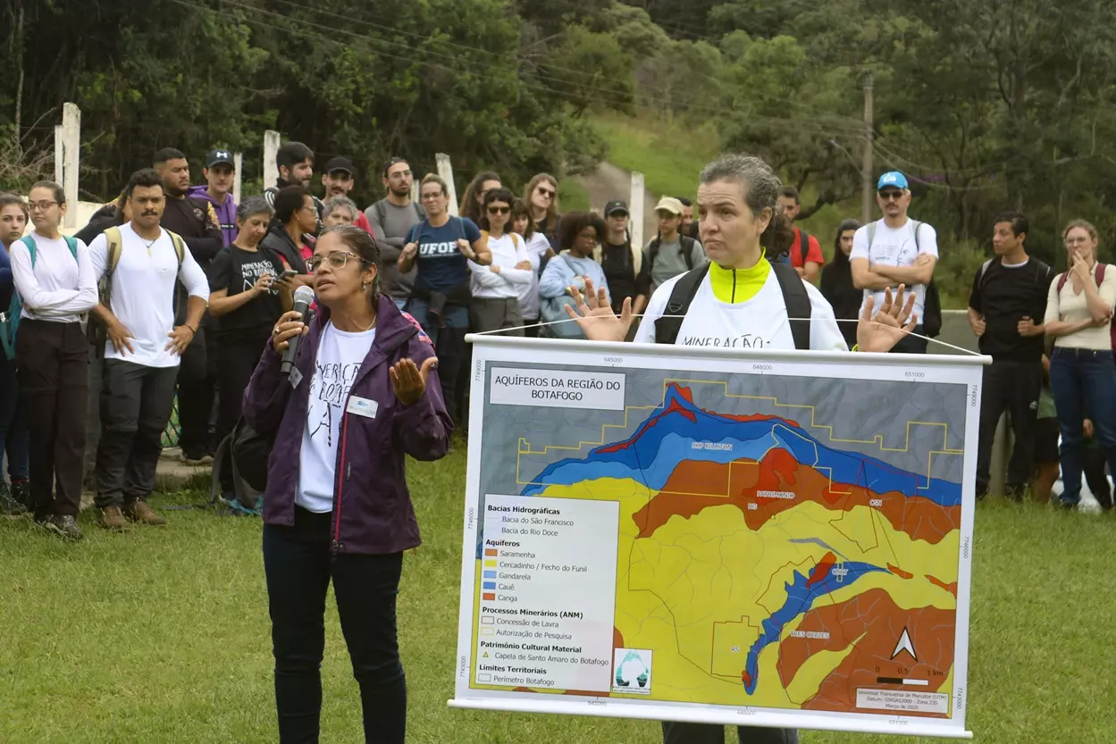 Durante a programação, os participantes percorreram nascentes e cachoeiras da Serra do Botafogo, região estratégica por abrigar aquíferos que abastecem comunidades locais e a região metropolitana de Belo Horizonte. Com debates técnicos e rodas de conversa, o foco foi denunciar os impactos de sete empreendimentos minerários em licenciamento na área, que colocam em risco não apenas os recursos hídricos, mas também o patrimônio histórico — como a Capela de Santo Amaro (séc. XVII), em processo de tombamento. O evento reforçou a urgência de proteger o território, classificado como “caixa d’água” do Quadrilátero Ferrífero, contra a expansão predatória da mineração.