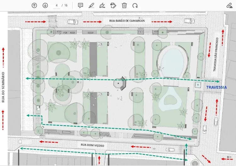 Ainda no aspecto conceitual da proposta, Tales exibiu um estudo de fluxo de pedestres e de veículos. No primeiro caso, justificando a necessidade da construção de travessias elevadas com acessibilidade nas proximidades do “bebedouro de cavalos” e na extremidade da praça, na junção com a rua Frei Durão, como ilustrado na figura abaixo.