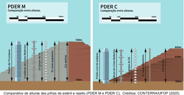 A outra, de até 190 metros de altura (que equivaleria a cinco estátuas do Cristo Redentor empilhadas) está prevista para ficar a menos de 300 metros de uma edificação em Camargos. As comparações de altura foram calculadas por pesquisadores do Conterra, Grupo de Pesquisa e Extensão sobre Conflitos em Territórios Atingidos, da Universidade Federal de Ouro Preto.