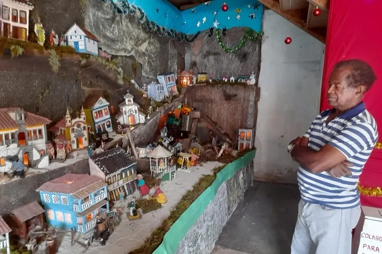 “Esse presépio nasceu em Ouro Preto, em 1920. Tem um navio aí que é da época do meu avô ainda, e pai, Elói Sacramento, aprendeu com ele. Em 1940, ele montava esse presépio na casa dele mesmo, no[bairro]Antônio Dias. Era com água, um engenho colocado debaixo da torneira é que fazia o presépio funcionar”,conta Hélio, a respeito dos primeiros anos do presépio.