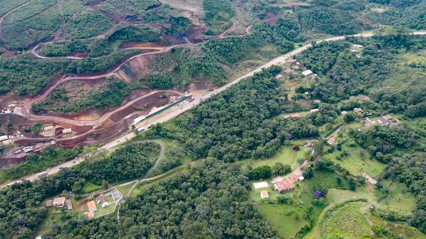 Duas realidades separadas pela rodovia, na parte superior esquerda observamos a Mina Patrimônio em funcionamento, na parte inferior direita, o povoado de Botafogo - Foto: Lui Pereira/Agência Primaz