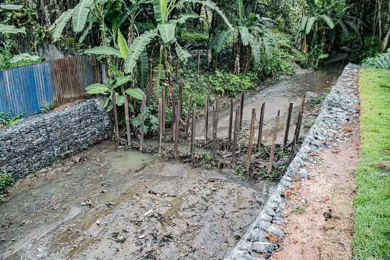 “A montante da bacia, temos trilhos que fazem a contenção de materiais sólidos, impedindo entupimentos na galeria que vai até o Ribeirão do Carmo. Já a jusante, na parte de baixo, temos uma galeria que faz o amortecimento de toda a rede pluvial; quando há uma chuva de intensidade, ela diminui a vazão da água que chega ao rio”, explicou.