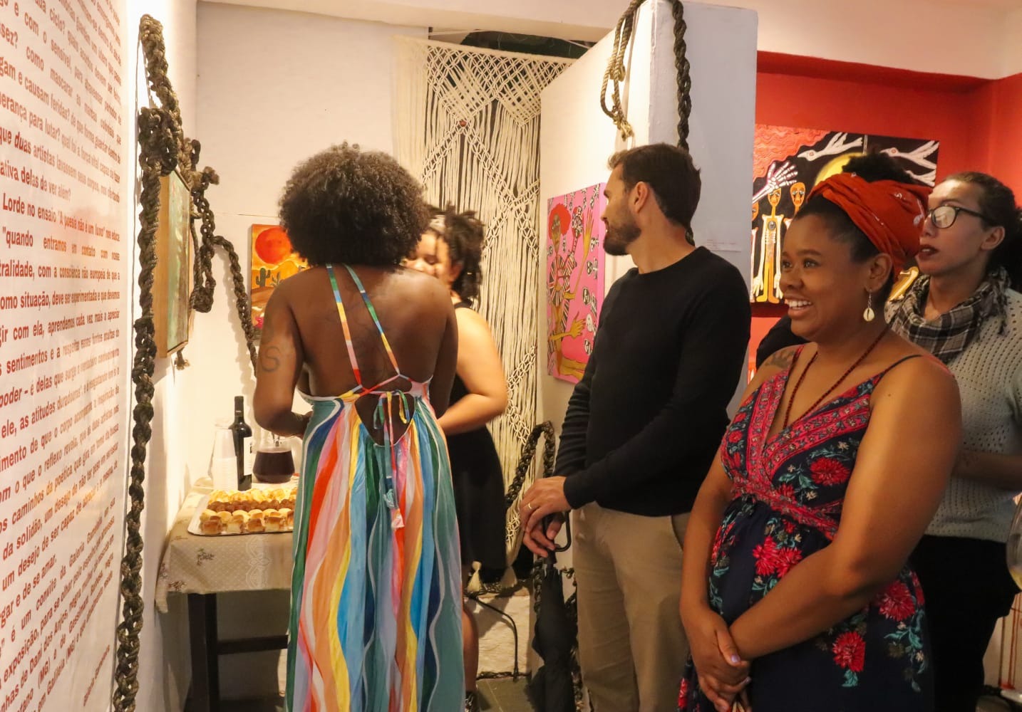 A chuva que caiu no início da noite não impediu que a abertura da IX SeMANA AFROfeminista fosse marcada por um grande público. Localizada no bairro Antônio Dias, a galeria é o primeiro espaço expositivo voltado à arte negra e periférica da cidade, um marco que representa a possibilidade de ocupar o território com autonomia e narrativa própria. “A gente estava com um pouco de receio, em relação ao público, porque acabou chovendo, mas ficamos muito surpresas, porque foram muitas pessoas da comunidade ouropretana e isso foi muito importante. Geralmente os eventos da cidade acontecem no centro da cidade e, como tava acontecendo ali no Antônio Dias, descentralizou”, comenta Kevilaini, integrante da equipe organizadora.