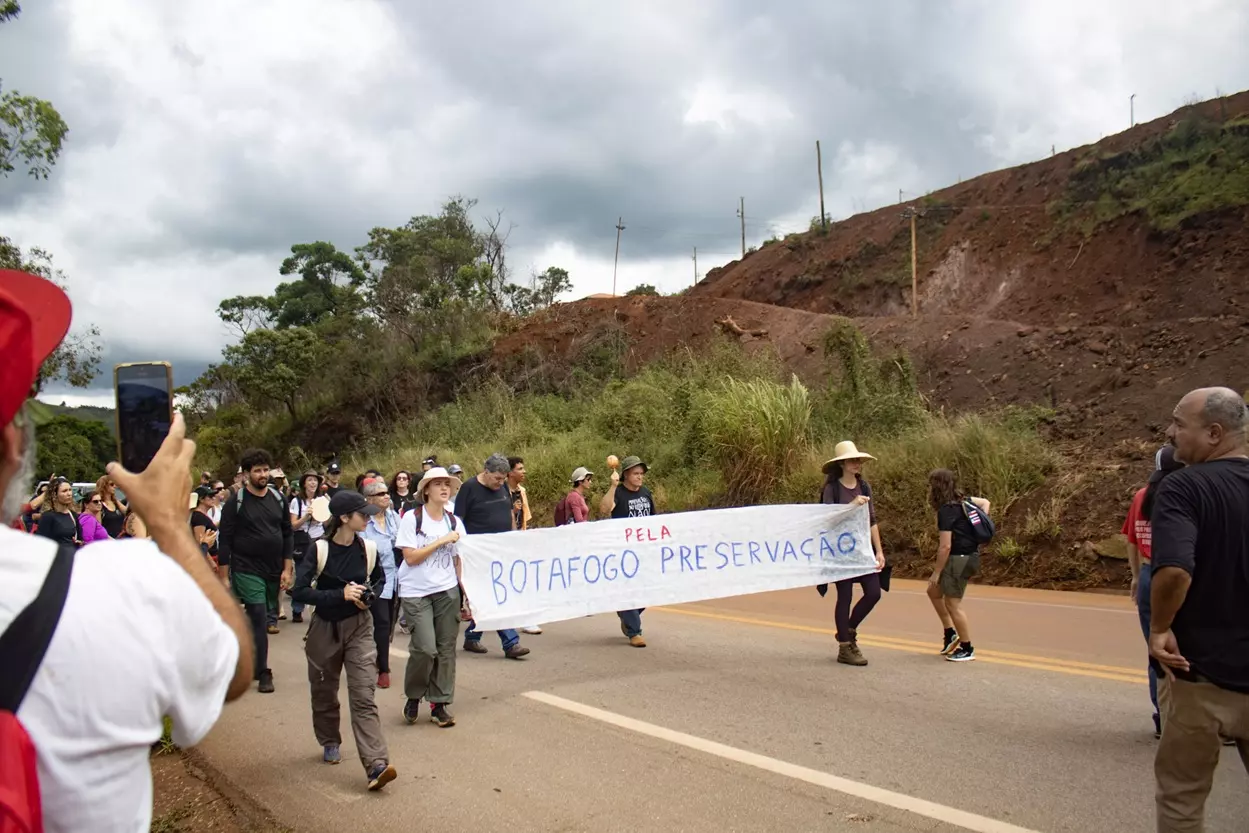 Após evento científico, comunidade de Botafogo e ativistas caminham até a portaria da Mina Patrimônio - Foto: Lui Pereira/Agência Primaz