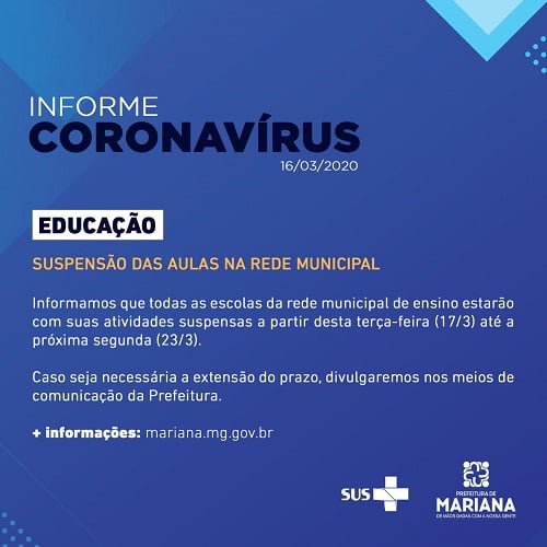 Na Universidade Federal de Ouro Preto (UFOP) está prevista para a tarde desta terça-feira (17) a realização de reunião extraordinária do Conselho Universitário para avaliar o a situação de funcionamento da instituição. Nossa reportagem não conseguiu retorno dos contatos feitos com as escolas particulares de Mariana, exceto o Centro Educacional Arte do Saber que suspendeu suas atividades, em suas duas unidades, a partir desta terça, com retorno previsto para o dia 23, mas com a possibilidade de prorrogação em função do desenvolvimento da pandemia na cidade.