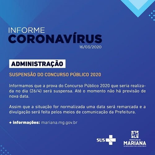 Notas oficiais publicadas pela Fundação Educacional de Mariana (FEMAR), mantenedora da Faculdade de Administração de Mariana (FAMA), e pela Fundação Presidente Antônio Carlos (FUPAC/UNIPAC) anunciaram a suspensão de suas atividades acadêmicas. Na FAMA as aulas foram suspensas a partir desta segunda-feira (16), por tempo indeterminado, enquanto na UNIPAR as atividades ficarão paralisadas de 18 a 22 de março, “seguindo recomendação do governo estadual”, de acordo com a nota.