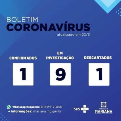 O boletim publicado pela Prefeitura de Mariana no início da noite desta sexta-feira informa que a cidade contabiliza um caso confirmado de contágio, um descartado e nove em investigação. O caso confirmado e o descartado já constavam da comunicação do dia anterior. Portanto, nas últimas 24 horas, o quadro apresentou o acréscimo de um caso suspeito.